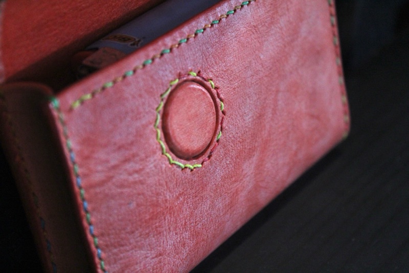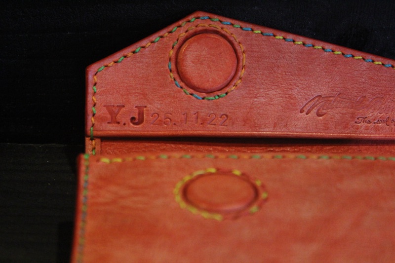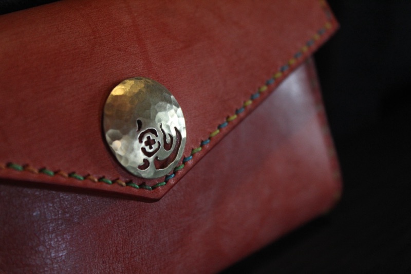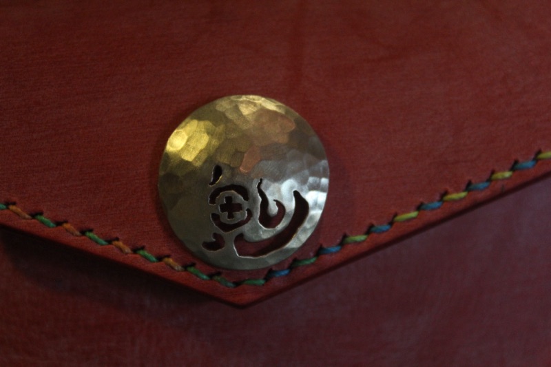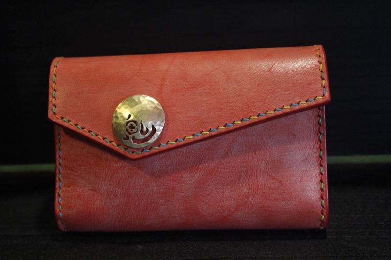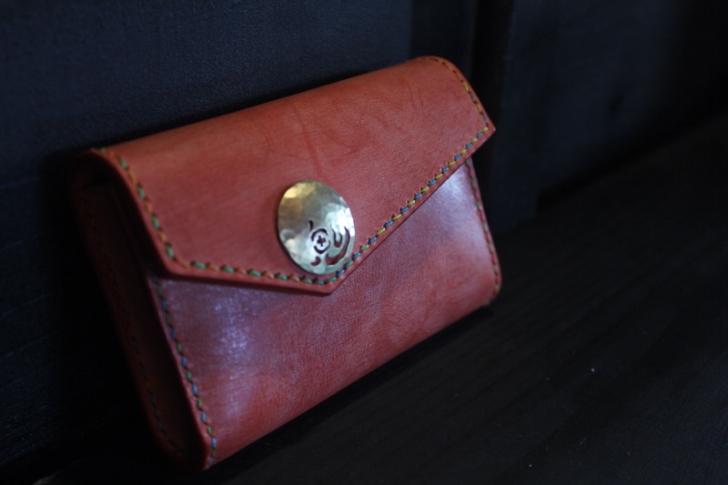 I received an order for a cigarette case made of rolled leather. At work, they call me "Oni" (demon), and from that conversation, my son jokingly suggested, "How about putting 'Oni' on the concho?" It started as a joke, but we decided to actually do it. When I told my wife, who would be making it, she thought it would be nice to suggest various characters, and from those options, we chose "Oni." I think it turned out really well. The stitching is in a colorful version, which adds a lively touch. The magnet part looks cute like the sun, and they really liked it... and I agree!